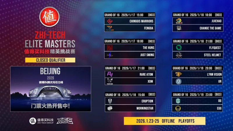 ZEM北京封闭预选赛16强对阵解析:八场BO3生死战,谁能踏上北京线开年盛宴——由歆赛电竞与值得买科技联合主办的2026 ZEM值得买科技精英挑战赛(Zhi-Tech Elite Masters,简称ZEM)将于1月登陆北京。这场时隔七年重返北京的反恐精英国际赛事,不仅有JKS、cadiaN、DANK1NG等多位明星选手齐聚,更有涵盖欧洲、亚洲、澳洲等地区的多支国际战队参赛,蒙古The Huns、 CW等,中国LVG、RA等, 澳洲FlyQuest,欧洲OG,JiJieHao。 16 支顶尖战队将为 VRS 积分与 ACL 外卡资格展开激烈角逐!