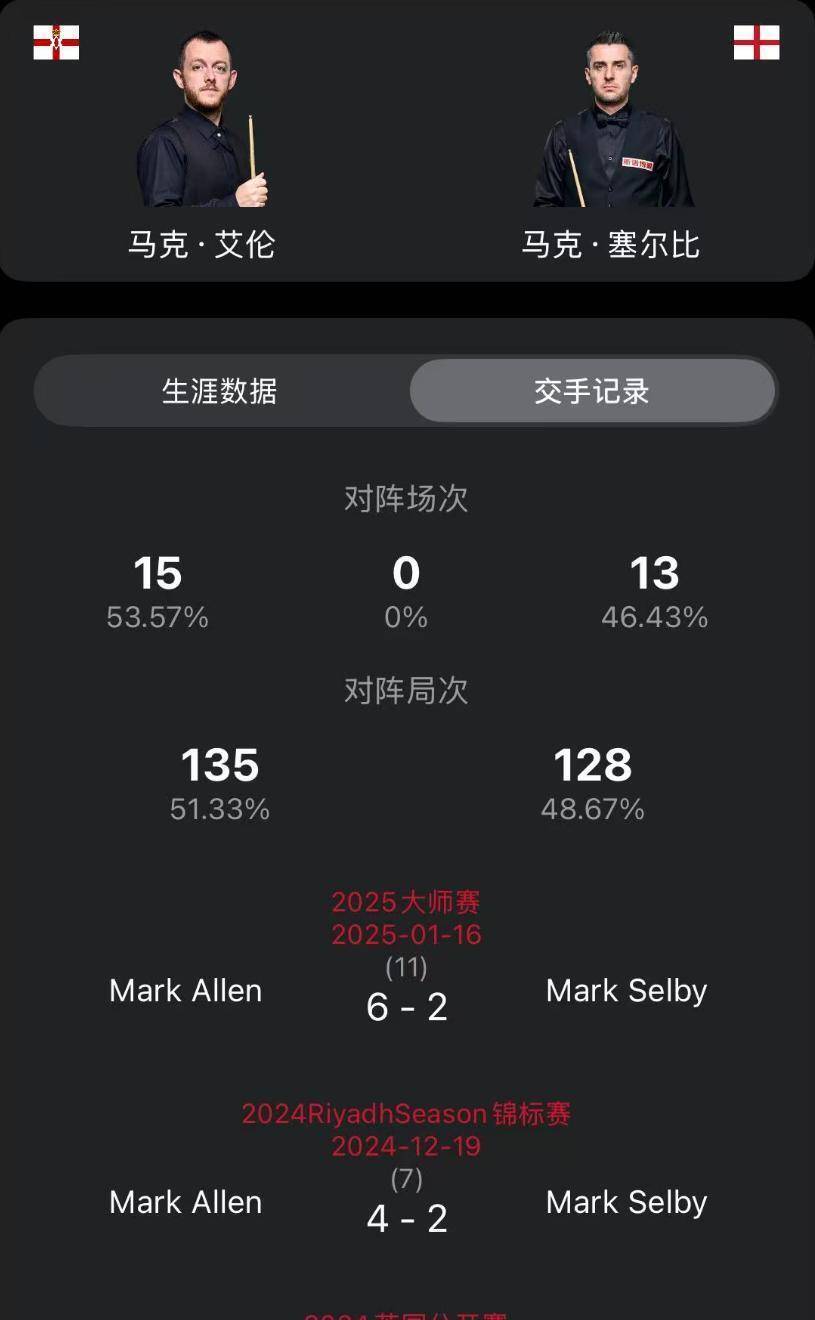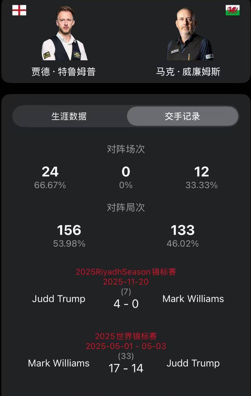 2月20日凌晨三点,贾德·特鲁姆普与马克·威廉姆斯的对决将是焦点。这将是两代“准神”之间的较量。历史上两人交手多达36次,特鲁姆普以24胜12负占据明显优势。他们最近一次碰面是在2025年的利雅得狂欢锦标赛,特鲁姆普以4-0获胜。而再上一次交手则是2025年的世锦赛,威廉姆斯以17-14胜出。