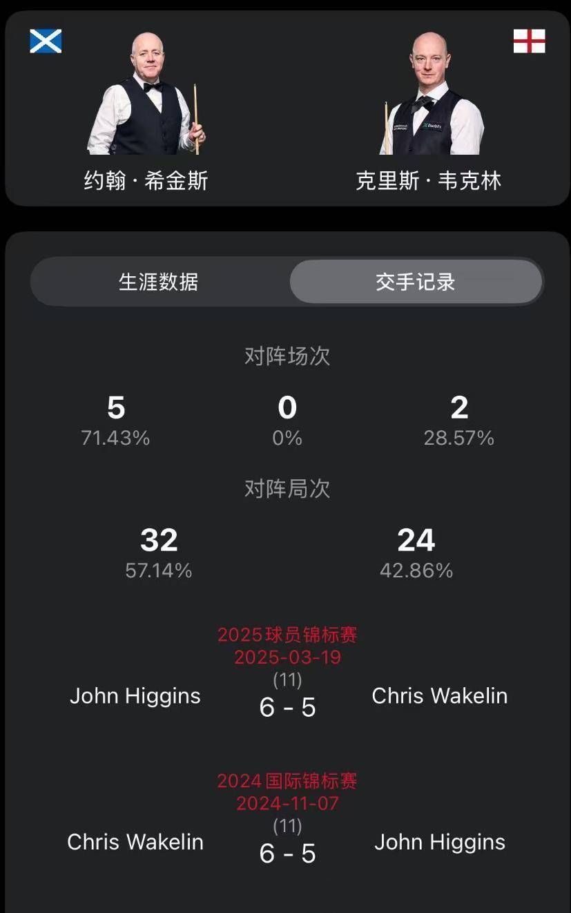 四分之一决赛的对阵形势也随之揭晓。根据赛程安排,比赛将从这一轮开始进入单桌直播阶段。北京时间2月19日晚九点,率先上演的是约翰·希金斯对阵克里斯·韦克林的比赛。两位选手此前有过7次交手,希金斯以5胜2负占据优势。他们最近一次交锋是在2025年的球员锦标赛首轮,当时希金斯以6-5险胜。
