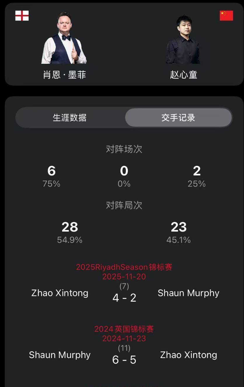 2月20日晚上九点,中国球迷的目光将完全集中在赵心童身上。他将迎战实力强劲的肖恩·墨菲。对于赵心童来说,这无疑又是一场严峻的考验。从历史交手记录来看,两人此前共对阵8次,墨菲以6胜2负占据绝对上风,堪称赵心童的苦主。赵心童的两次胜利分别来自2018年的里加大师赛,当时他4-0横扫墨菲,以及2025年的金球大奖赛,他以4-2获胜并最终夺得该赛事冠军。值得一提的是,自从赵心童在2025年夺得世锦赛冠军后,他与墨菲只交手过一次,在2024年的英锦赛首轮,持外卡参赛的赵心童以5-6惜败。